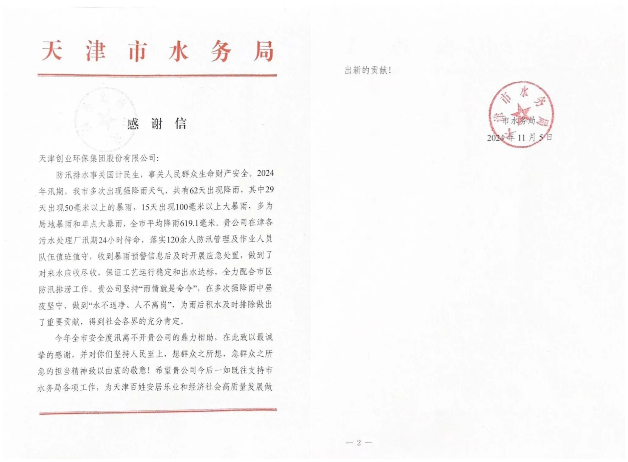 日前,創(chuàng)業(yè)環(huán)保集團(tuán)收到了來(lái)自市水務(wù)局的感謝信,對(duì)集團(tuán)在2024年汛期期間全力配合市區(qū)防汛排澇工作做出的積極貢獻(xiàn)表示肯定與感謝。