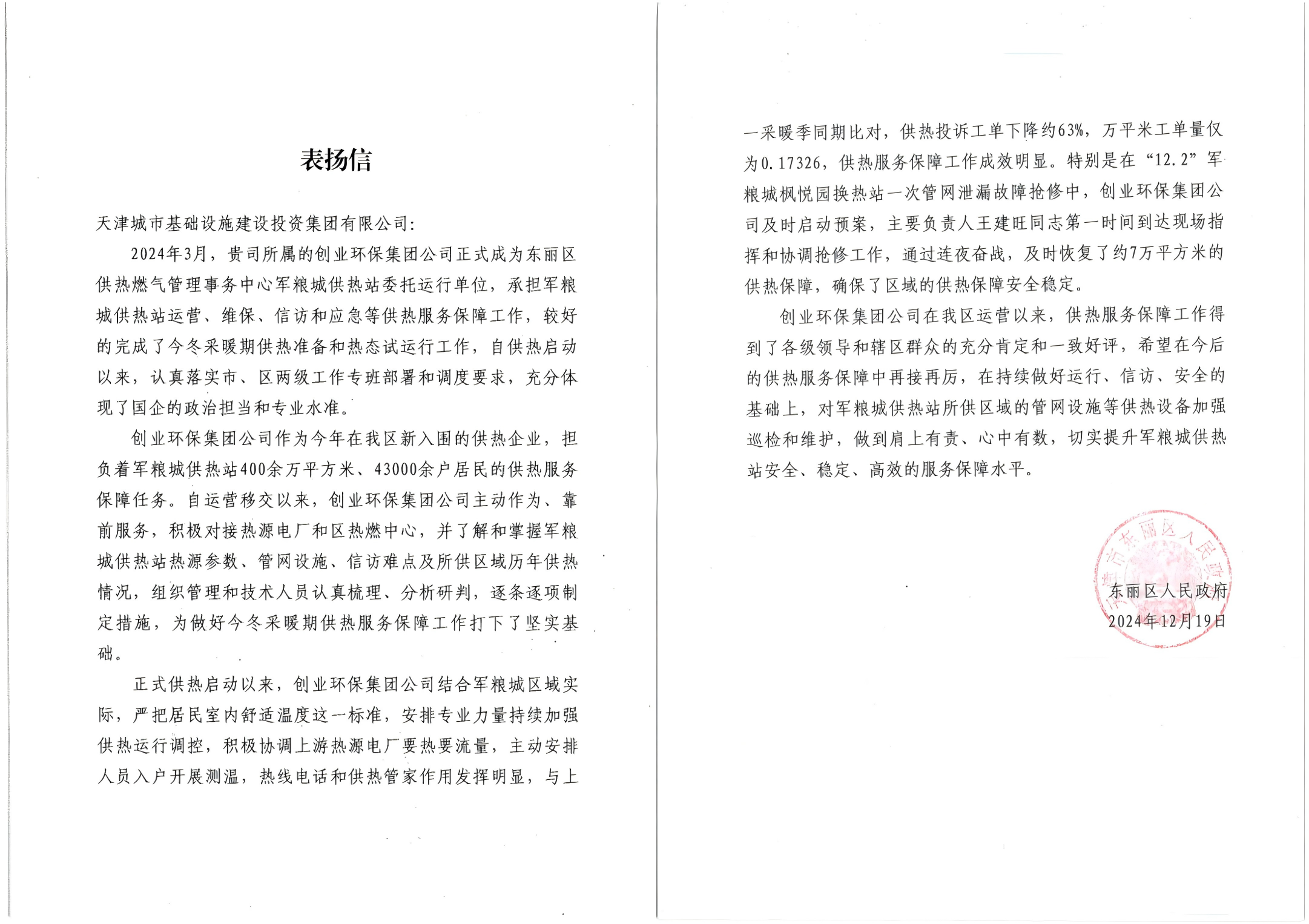 近日,城投集團收到了一封來自東麗區人民的表揚信,對創業環保集團天創綠能公司自供熱啟動以來全力保障供熱質量,展現國企政治擔當的相關工作表示肯定。