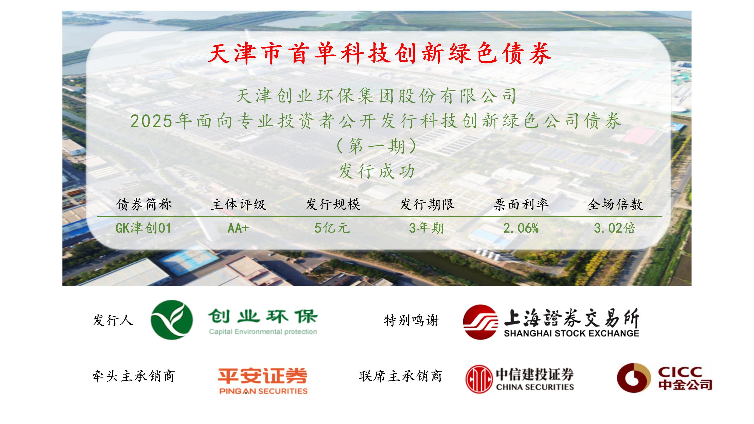 9月11日,在天津證監局和城投集團的指導下,創業環保集團2025年面向專業投資者公開發行科技創新綠色公司債券(第一期)在上海證券交易所成功簿記發行,是天津市首單“科技創新+綠色”債券,發行規模5億元,期限3年期,票面利率2.06%,全場認購倍數達3.02倍。這是創業環保集團對上合組織天津峰會關于深化綠色產業協同、強化科技合作共識的積極響應,以金融創新之為“主動出擊”,為區域可持續發展提供了扎實實踐樣本。